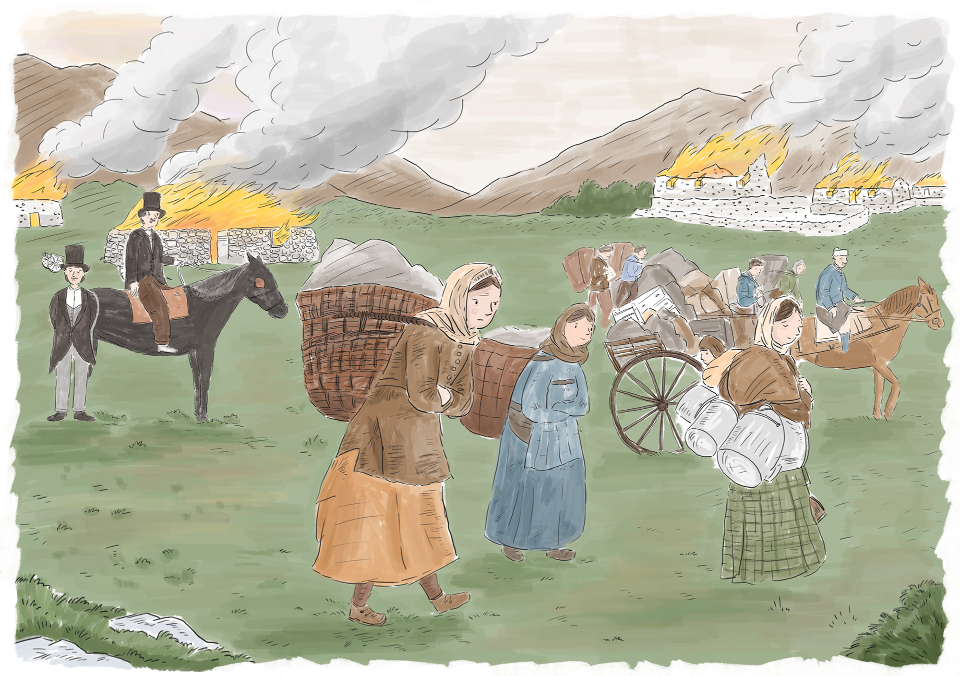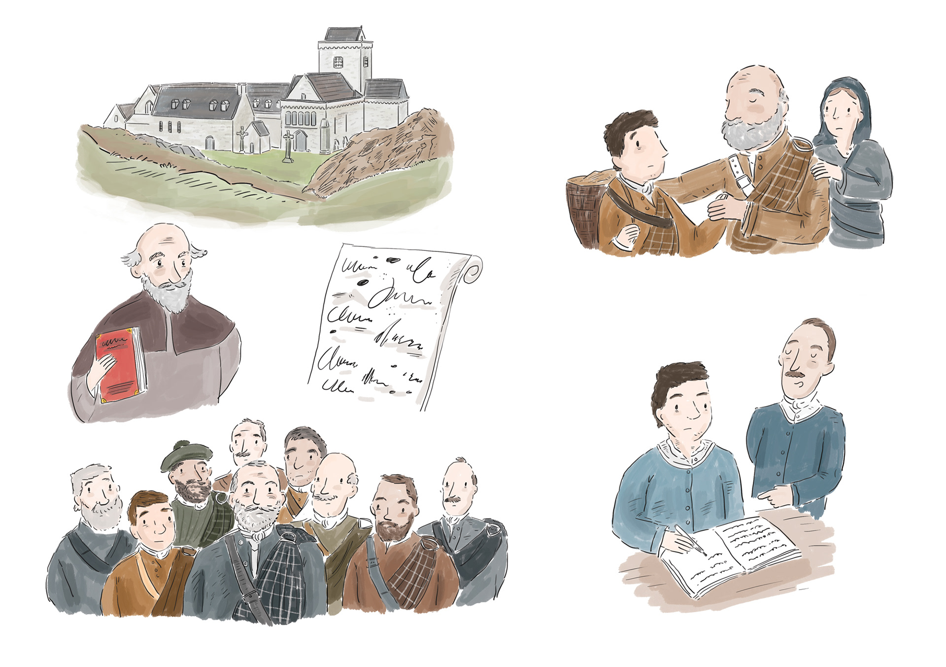 A series of digital illustrations highlighting historical ways of life in the highlands and important events.